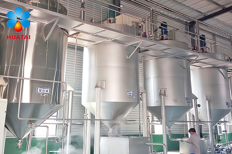 6、精煉:經過浸出或壓榨得到的原油含有一些雜質,需要經過脫色、脫臭等一些列精煉工藝,以去除其中的雜質和不良成分,提高油脂的品質。時,為了確保生產的安全和環保,設備應具備良好的密封性和廢氣處理裝置。