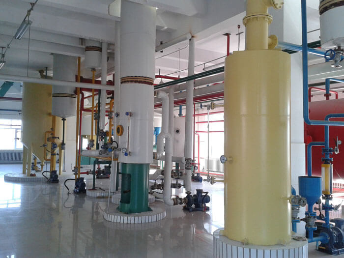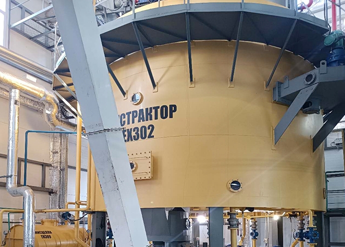混合油蒸發與汽提:浸出器內經過帳篷式過濾器過濾后的混合油被送至平轉器上方的過濾器進行二次過濾。過濾后的混合油進入混合油罐,當其濃度達到要求時,進入長管蒸發器進行蒸發。蒸發后的混合油進入層碟式汽提塔進行汽提,浸出毛油從塔底流入毛油箱,再由泵送至精煉油車間。